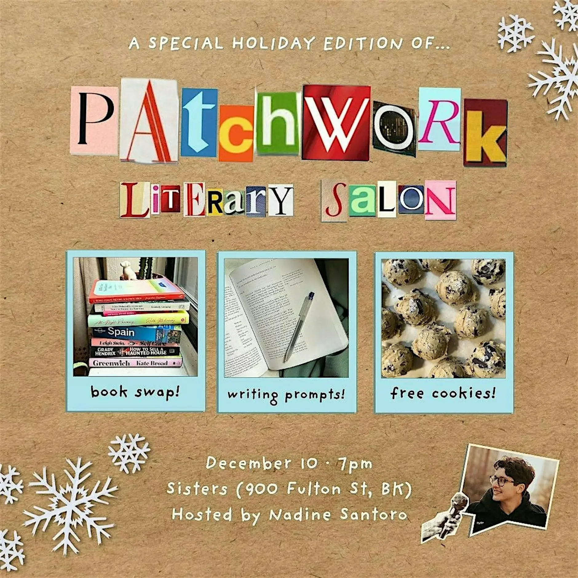 Patchwork Literary Salon brings together authors across genres and stages in their careers to create a colorful tapestry of Brooklyn’s writing community. Curated and hosted by Nadine Santoro, this monthly reading series features brief readings, lively conversation, drink specials, and an opportunity to mingle and connect with fellow writers and readers!